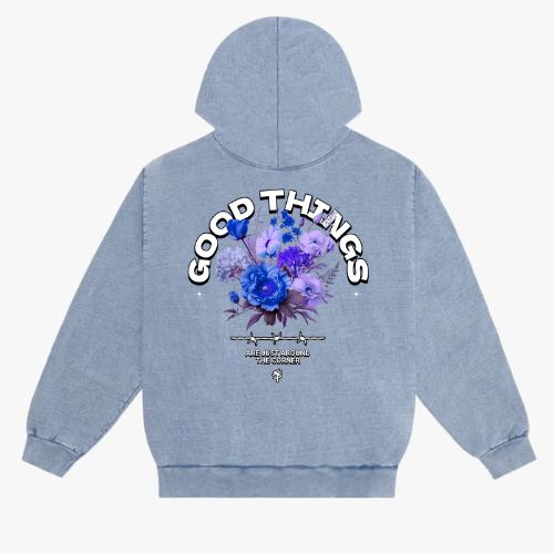 The beautiful back graphic showcases a vibrant bouquet of flowers in striking shades of blue and purple, symbolizing growth and renewal. Above, the words "Good Things" arc gracefully, with "Are Just Around the Corner" beneath, encouraging a mindset of optimism and patience.
