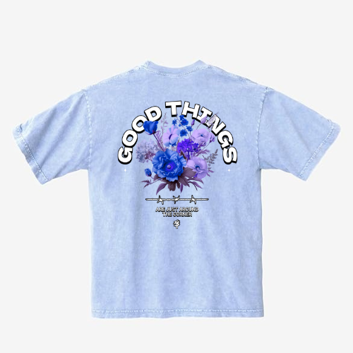 The eye-catching back design features a vibrant bouquet of blooming flowers in shades of blue, purple, and lavender, symbolizing growth, hope, and renewal. Surrounding the flowers, the bold text “GOOD THINGS” curves above the artwork, while below, the reassuring phrase “Are Just Around the Corner” serves as a reminder to remain patient and hopeful. The barbed wire beneath the text symbolizes the trials and challenges we face, while the blooming flowers remind us that beauty and good things emerge even in hardship.