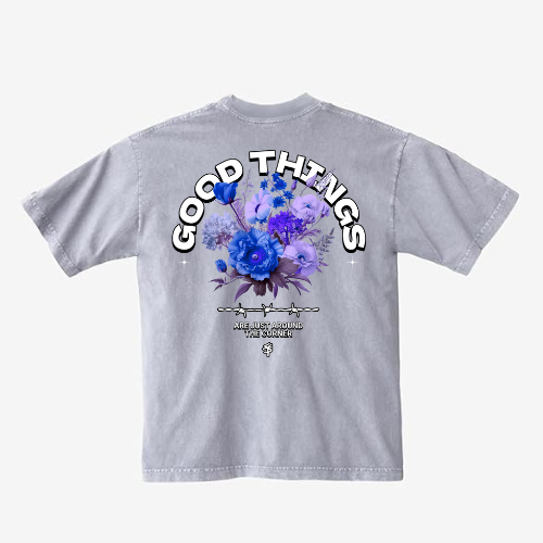 The eye-catching back design features a vibrant bouquet of blooming flowers in shades of blue, purple, and lavender, symbolizing growth, hope, and renewal. Surrounding the flowers, the bold text “GOOD THINGS” curves above the artwork, while below, the reassuring phrase “Are Just Around the Corner” serves as a reminder to remain patient and hopeful. The barbed wire beneath the text symbolizes the trials and challenges we face, while the blooming flowers remind us that beauty and good things emerge even in hardship.