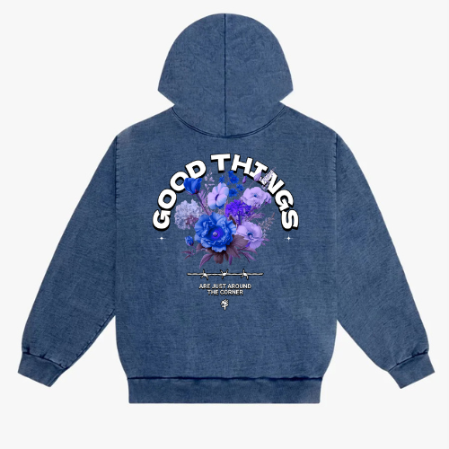 The beautiful back graphic showcases a vibrant bouquet of flowers in striking shades of blue and purple, symbolizing growth and renewal. Above, the words "Good Things" arc gracefully, with "Are Just Around the Corner" beneath, encouraging a mindset of optimism and patience.