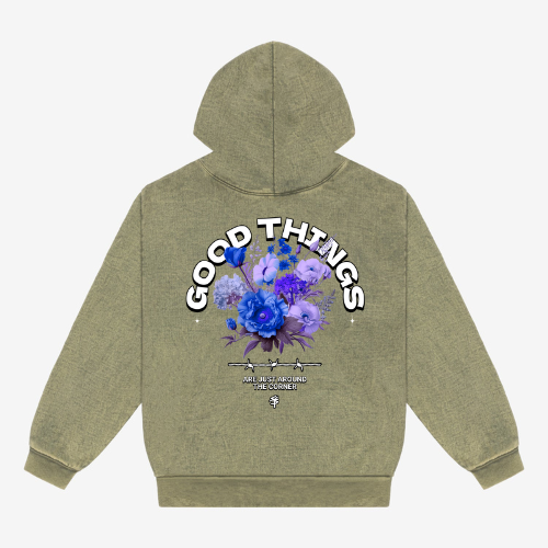 The beautiful back graphic showcases a vibrant bouquet of flowers in striking shades of blue and purple, symbolizing growth and renewal. Above, the words "Good Things" arc gracefully, with "Are Just Around the Corner" beneath, encouraging a mindset of optimism and patience.